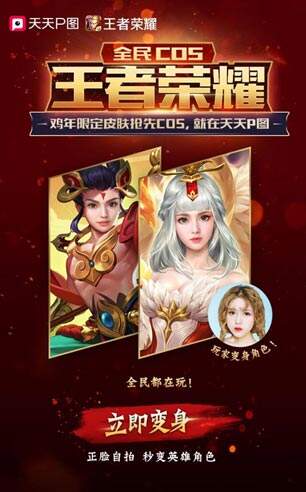 王者荣耀携手天天P图,全民cos抢先玩。李白、王昭君、关羽鸡年限定皮肤将在天天P图中首发,等不及的玩家快去天天P图中体验一些变身的喜悦吧~无论是善良的公主王昭君还是剑仙李白或者是霸气的关二爷还有萌萌又可爱的妲己宝宝我,总有一款适合你,快拿起手机拍下自己的五官,开启英雄之旅吧~