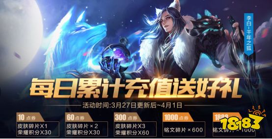 活动期间每日充值均可获得皮肤碎片、荣耀积分、大量铭文碎片等奖励,好礼送不停!