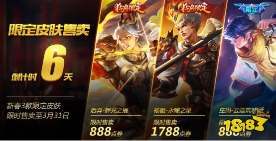 温馨提示:新春3款限定皮肤-杨戬-永曜之星、后羿-辉光之辰、庄周-云端筑梦师限时售卖将在3月31日结束,请各位召唤师抓紧时间购买~