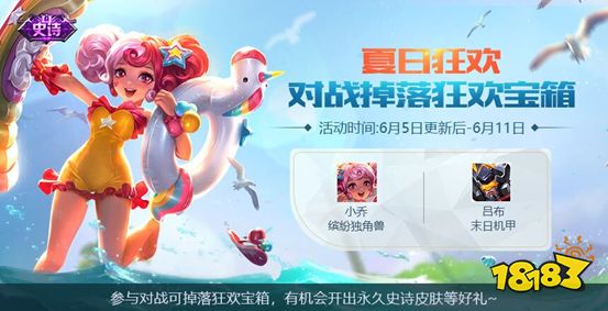 活动期间,参与指定模式对战可获得【狂欢宝箱】,6月9日-6月11日与好友组队每日完成一局更可额外获得【狂欢宝箱】*1!,开启宝箱有机会开出永久史诗皮肤(缤纷独角兽-小乔,末日机甲-吕布)、英雄等好礼!