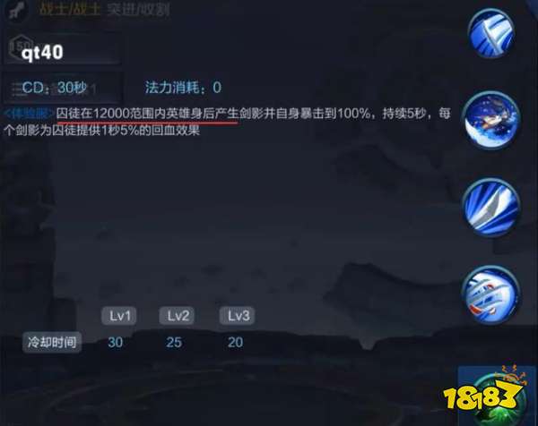 12000范围内英雄身后产生剑影,自身100%暴击持续5秒,每个剑影为囚徒提供1秒5%的回血效果