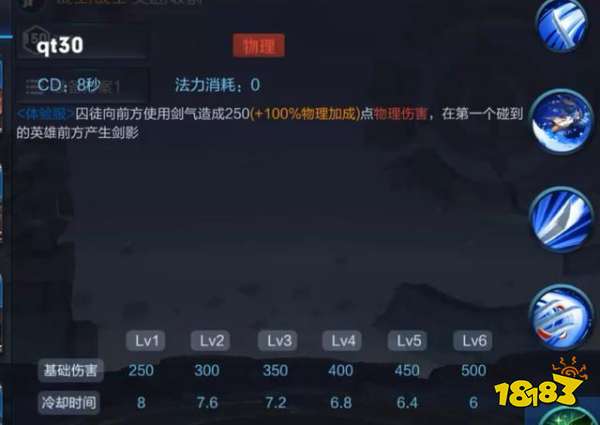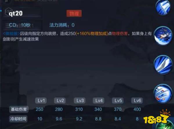 囚徒向指定方向跳劈(估计有点类似典韦大招的效果)能造成250的加160%的物理加成伤害,如果身上有2技能产生的剑影还有减速效果,看到1技能的描述就知道囚徒是个很强势的战士。