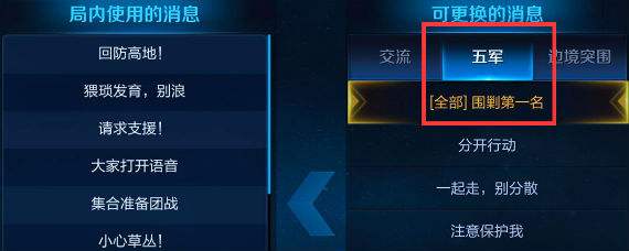 3、在五军对决下面找到围剿第一名,添加到局内使用消息即可使用!