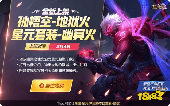 孙悟空星传说皮肤幽冥火登陆紫星币商店,玩家届时可前往商城-星元-紫星币专区兑换