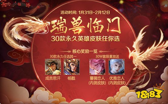 30款永久英雄皮肤任你选,30万套内测皮肤抽不停!抢瑞兽红包还有机会获得百万现金或Q币。