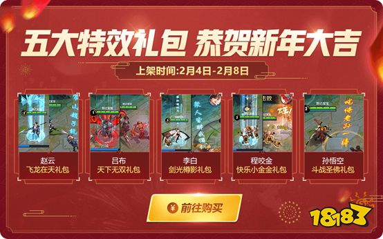 赵云-飞龙在天、吕布-天下无双、李白-剑光樽影、程咬金-快乐小金金、孙悟空-斗战圣佛特效礼包上架,可前往商城进行购买查看。