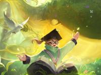 在这个与自然和谐相处、一片祥和的世界中,庄周作为智者,与自然之灵化身的鲲朝夕相伴,是非常好的朋友。庄周戴着的博士帽、大眼镜,穿着的博士服,体现了他智者的身份;而他的座驾“鲲”,设计大大也花了很多的小心思,更多的融入了自然元素:草地、花朵、虚化的身体等。