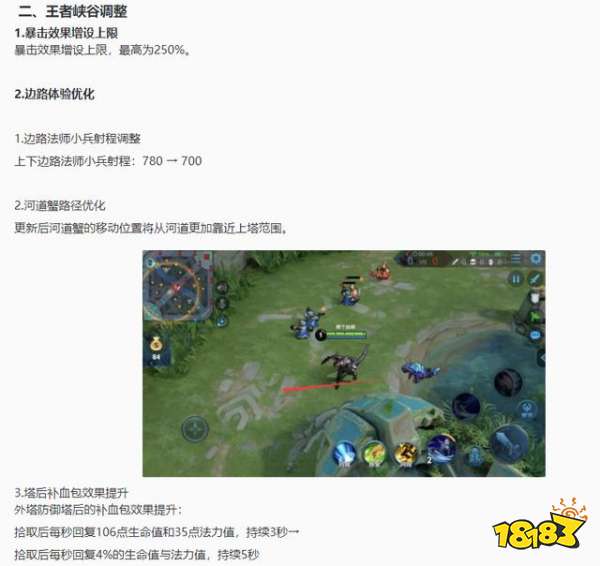 然后就是法师小兵射程降低;河道蟹更加偏向塔下位置。上单被压制的原因也就是初期根本点不过射手,一般都是到4级之后才能单挑打过射手,然而之前被压制的情况下,上单很难拿到河道蟹和远程兵的经验,那么等级就会被射手拉开。而改动之后法师兵的经验就能稳吃,河道蟹也更加容易抢到,如果上单先4级,那么很可能瞬间击杀压制自己的射手。还有就是血包按比例回复也对战士更加有利。