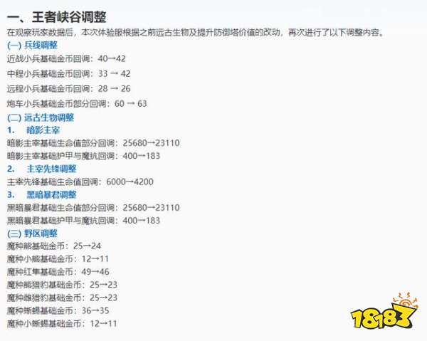 下面我们来看最新的峡谷调整。其中兵线的金币都是在进行回调,回调之后和正式服基本是一样的,但是炮车的金币降低了。而这次调整中最关键的就是野区的经济降低了,那么打野虽然等级不受影响,但是装备成型的速度要比改动前慢了很多,而上单英雄最弱的时期就是前期,如果打野装备差,也就更难抓死上单。
