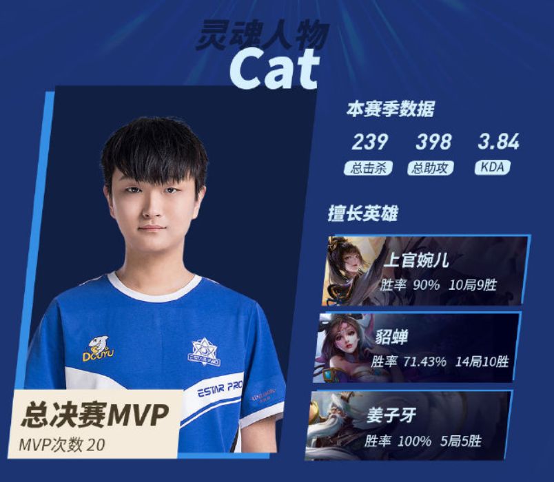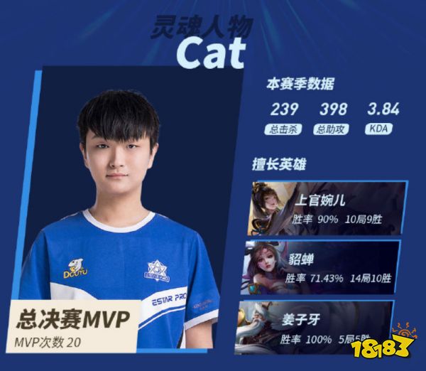 首先自然就是总决赛MVP选手猫神了,他终于在离开QGhappy后也证明了自己,各项数据十分突出,而擅长的英雄有3个之多,其中上官婉儿和貂蝉的胜率都非常高,说明猫神还是擅长刺客一类的法师,而姜子牙的胜率也不错,这个英雄主要是看大家的配合,看来eStar在T将军的指挥下整体实力也真正变强了。