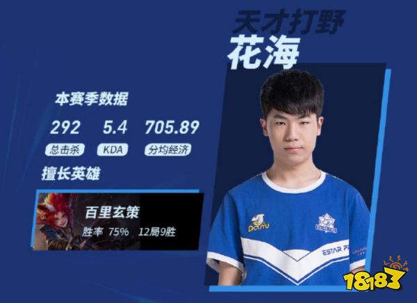 eStar这次能夺冠,自然是离不开这个赛季的新人打野花海了,在他未进入KPL之前,很多人都非常看好他,后果不其然,在eStar和其他队伍的比赛中,常常有各种天秀操作,尤其是百里玄策这个英雄,他使用的胜率非常高,看来这就是他的本命了。