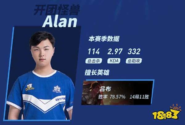 Alan是在亚运会之后加入eStar的,以前在QG的时候,他和猫神的配合就非常不错,一起到了eStar后也是再次产生了连锁反应,而他最擅长的英雄就是吕布了,这个英雄也蛮符合他的形象的,永远都是那么的霸气!