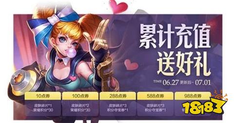 四、许久未开启的充值福利再次上线,持续至7月1号结束,只不过这次不是每日送额外奖励,而是累充获得最多13个皮肤碎片、3张积分夺宝抵用券和300铭文碎片的奖励。