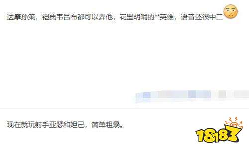 还有网友表示,孙策,达摩,典韦,吕布等等都可以对付新英雄曜,这个新英雄花里胡哨的,语音还中二,一点都不好玩。