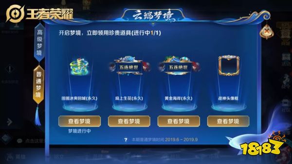 云端梦境福利系统奖励公布,普通梦境的奖励有圈圈冰爽回城特效、扇上生花荣耀播报、夏日海岸荣耀播报、战神头像框、圣诞狂欢头像框,高级梦境奖励包括水果甜心皮肤、化身博士皮肤、海之征途皮肤等。