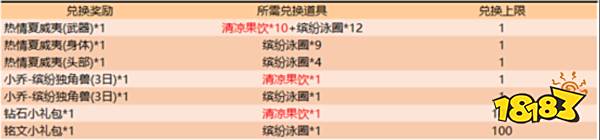 收集清凉果饮+缤纷泳圈两个道具兑换奖励活动,可以兑换一套缤纷独角兽的星元皮肤,以及皮肤体验卡六天。活动从16号至30号,一共最多获得21个清凉果饮和42个缤纷泳圈道具。