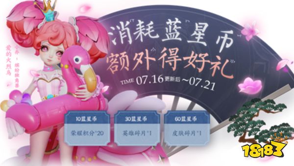 16日至21日消耗蓝星币活动,累计消耗60个蓝星币可以获得二十荣耀积分,一个英雄碎片和一个皮肤碎片。