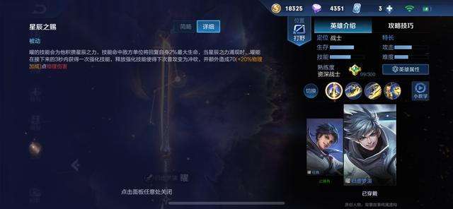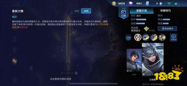 被动-星辰之赐:曜的技能会为他积攒星辰之力,技能命中敌方单位将会恢复自身2%最大生命,当星辰之力涌现时,曜在接下来的3秒内获得一次强化技能,释放强化技能使得下次普攻变为冲砍,并额外造成70(+2%物理加成)点物理伤害。