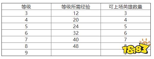 玩家的初始等级为3级,对应可上场的英雄数量为3个,详细的升级所需经验和对应的可上场的英雄数量如下: