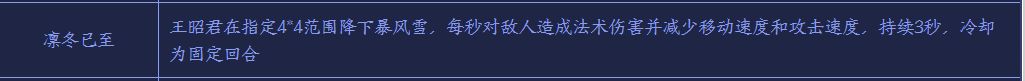 王昭君在指定4*4范围降下暴风雪,每秒对敌人造成法术伤害并减少移动速度和攻击速度,持续3秒,冷却为固定回合