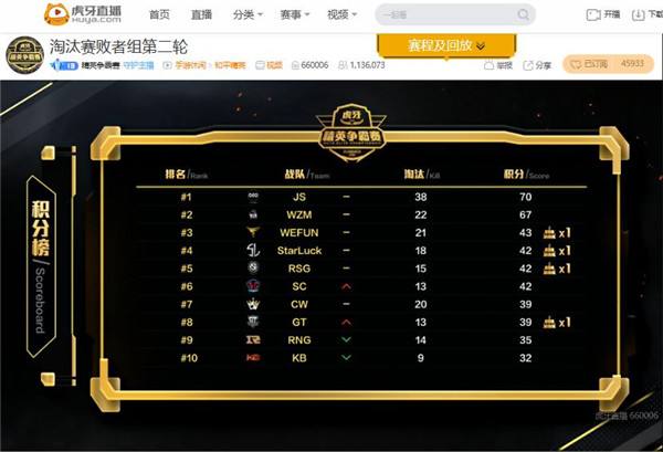8月9日,虎牙精英争霸赛淘汰赛败者组第二轮正式开战。到了一战定乾坤的淘汰赛阶段,所有战队不再保留余力,使出浑身解数在战场上厮杀。最终本轮比赛JS成最大赢家,他们在一鸡未吃的情况下,凭借全场最高的38个淘汰登顶榜首成功晋级。而分别吃到一鸡的WEFUN、Starluck和RSG分列三四五也晋级成功。另外一支预选赛上发挥出色的Jstar,由于圈运不佳加发挥失常,最终遗憾淘汰。