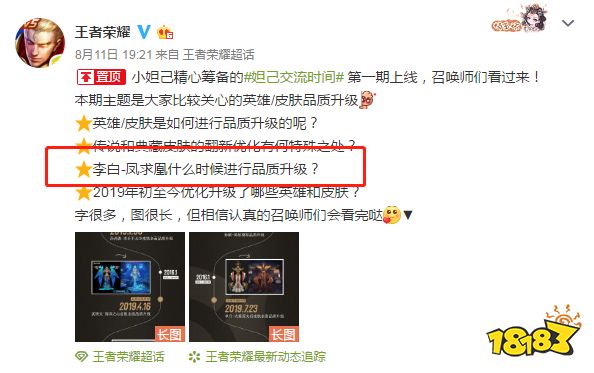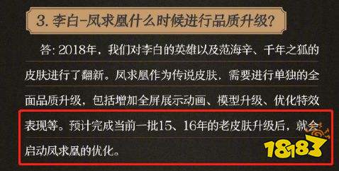 我们可以看到,官方已经明确表示李白的凤求凰会进行优化,并会增加全新的开场动画,并对模型、技能特效进行升级。 但是要完成当前15、16年的老皮肤升级后,才会启动凤求凰的优化。
