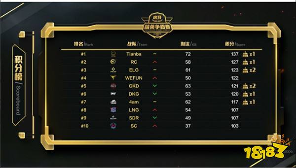 8月24日,虎牙精英争霸赛总决赛第二日继续精彩开战。与首日大部分战队和平交流不同,第二天比赛场面异常火爆,选手们都希望从正面钢枪中找回状态。ELG当之无愧成为第二日比赛中最闪亮的明星,凭借单日豪取93分的壮举,身为“内战幻神”的他们一举杀入前三。而首日发挥出色的4AM状态不佳,连续转移遭到淘汰的他们下滑至第七。