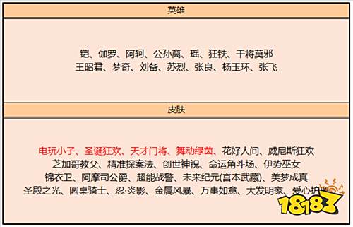 鲁班-电玩小子(288碎片)、吕布-圣诞狂欢(78碎片)、刘禅-天才门将(88碎片)、蔡文姬-舞动绿茵(88碎片)