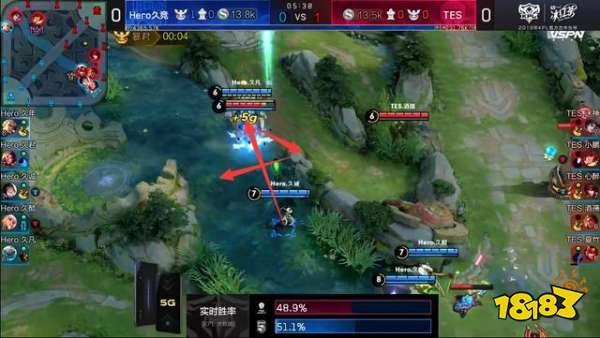 但久诚这一局婉儿依然用操作为Hero打开了局面。他首先用一波十字上天击杀掉对方辅助,拿下小龙,帮助Hero续上了节奏。紧接着在野区敏锐的抓到机会,闪现上天打残了周瑜,Hero队友及时跟上,杀掉了TES辅助。