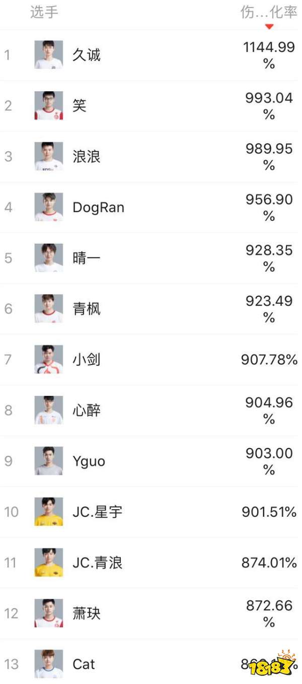 有了钱的久诚开始发力,直接用输出融化了TES前排。这里不得不提久诚的另外一个特点,久诚除了打钱快,另一个重要的特点是伤害转化率奇高,在18年春、18年秋、19年春这三个赛季,久诚的伤害转化率位于所有选手中的第一名。