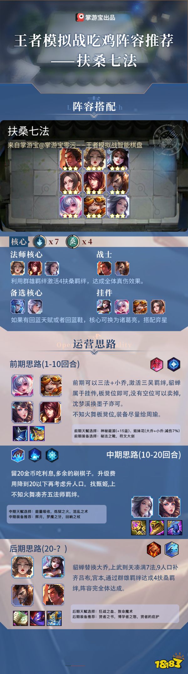 阵容思路就是把当前版本非常强力的真伤羁绊扶桑,搭配稷下羁绊复制出更多拥有真伤的分身来打输出。拿牌思路也非常简单,前期扶桑刷到就拿,4-5人口时再上两个星数最高的英雄就可以了,此时必须要卡人口升星,因为扶桑的牌质量都不高,人口太高反而会降低出牌几率。在培养出2个到3个两星英雄后就可以继续升人口了,接下来就要拿紫色宫本,只要拿到这个英雄和四个扶桑,那阵容就基本成型了。