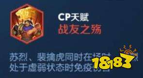战友之殇,CP金色天赋之一,由不屈铁壁、破灭突厥的唐朝军事家苏烈和节奏型刺客、代表入侵和强势的裴擒虎组合而成。