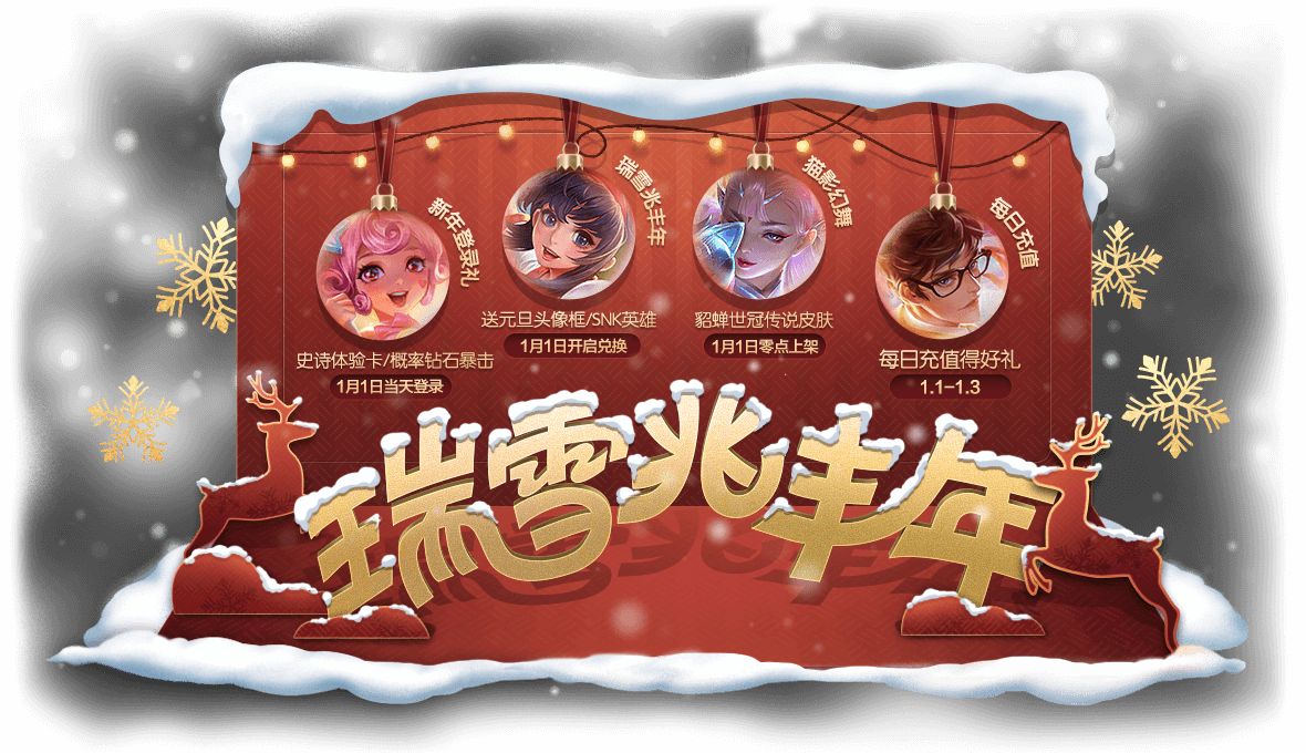 1. 新年登录游戏得好礼,赛末冲刺领奖励;皮肤体验卡自选宝箱、钻石礼包等你来拿。参与活动收集2020迎新雪球送SNK英雄自选,1月1日零点开启兑换!