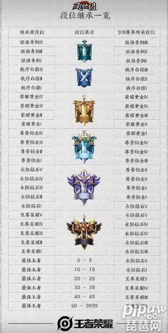 s18赛季和s17赛季的继承表对比起来,除非了在外观上有一定的变化外,里面的段位并未发生变化!同样还是老样子,黄金段位基本不变,铂金段位差不多往下掉1个段位,钻石段位往下掉2个段位,至尊星耀和最强王者的话变化比较大的。