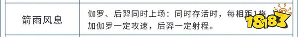 箭雨风息 ※天赋分类※ 通用 ※天赋属性※ 伽罗、后羿同时上场:同时存活时,每相距1格,增加伽罗一定攻速,后羿一定射程。