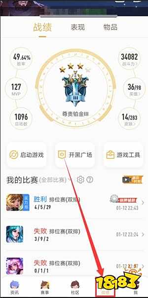 3、点击下方的对战资料,就可以看到当前赛季和全部比赛,点击全部比赛,在下方就可以看到五杀次数了。