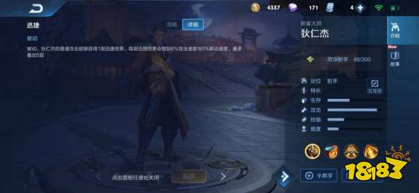 被动技能方面:狄仁杰有两个被动,一个是普通攻击的被动技能-迅捷,普攻获得1层迅捷效果,每层迅捷效果会增加6%攻速和5%移速,最多叠加5层,也就是说叠满的话会得到30%的攻速和25%的移速加成。