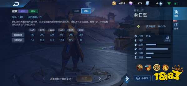 这与狄仁杰的射手定位是吻合的,简单粗暴的普通攻击才是射手的主要输出方式。基于迅捷的叠加效果,要求狄仁杰在加入战团的时候,有条件的话最好叠满被动,获得最高的攻速和最大的移速,以最佳的状态投入战斗。