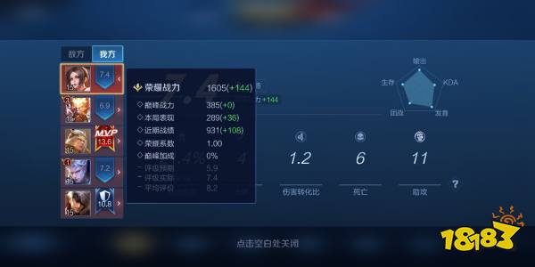 3、之后点击界面上的荣耀战力,即可查看本局的表现分以及巅峰战力,近期战绩等。