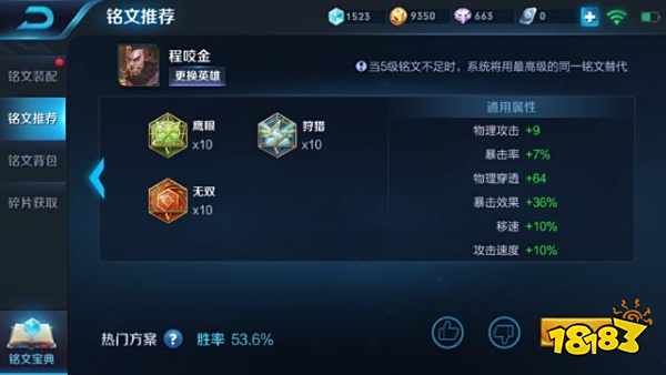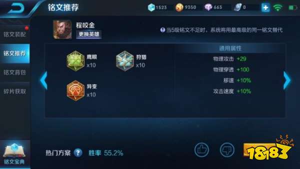 程咬金铭文推荐一,十狩猎、十鹰眼、十异变,也就是百穿铭文,这种出装铭文特别适合切脆皮,而且持续输出能力非常强。推荐二,十狩猎、十鹰眼、十祸源,这种出装铭文爆发性非常强,可以一瞬间打出特别高的伤害,用来秒杀脆皮,特别好用。