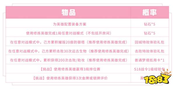 【最终宝箱奖励】:完成全部修炼任务后可获得,打开后可任意选择以下奖励之一:英雄碎片*15、皮肤碎片*15、云梦泽英雄专属抵扣红包*1、长城守卫军英雄专属抵扣红包*1、三分之地英雄专属抵扣红包*1。