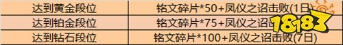 峡谷春风好礼送,赛末冲刺达到指定段位可领取铭文碎片+凤仪之诏击败特效(期限)。