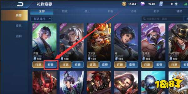 3、然后选择你想索要的英雄、皮肤、道具,点击索要。
