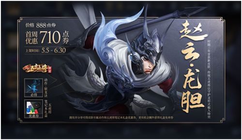 【活动内容】:活动期间拥有并分享赵云-龙胆,得赵云-龙胆皮肤专属动作:银龙诀和周边商城五虎将笔记本礼盒8.8折优惠券,有概率额外获得五虎将笔记本礼盒免单券(全服限量30张),五虎将笔记本礼盒优惠券 和 五虎将笔记本礼盒免单券 在5月12日过期后将无法使用。