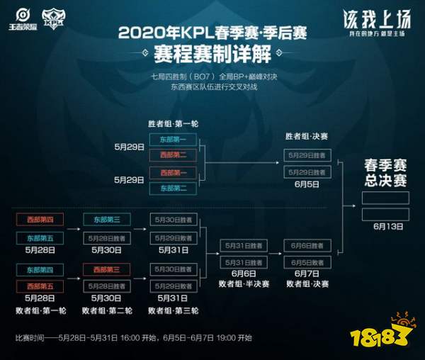 2020年KPL春季赛季后赛将于5月28日正式开启。其中5月28日-5月31日每日16:00开始,每日两场BO7对决,6月5日-6月7日每日19:00开始,每日一场BO7对决。6月13日将进行总决赛。