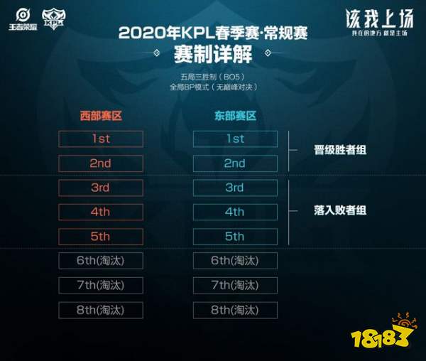 2020年KPL春季赛季后赛赛制将延续七局四胜制(BO7)全局BP+巅峰对决的模式,东西部赛区进行交叉对战,即东(西)部第一对阵西(东)部第二,东(西)部第四对阵西(东)第五。