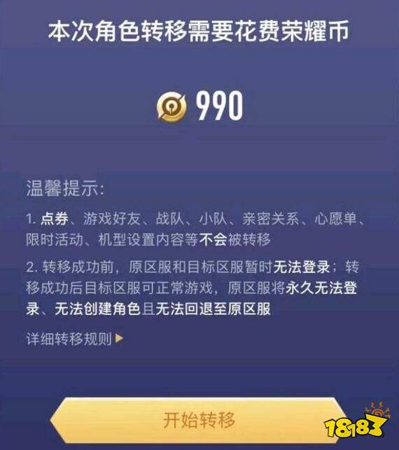 第三步、可以看到本次转移价格,转区需要990荣耀币,也就是转一次要99元,这个不管是安卓转苹果还是苹果转安卓价格都是一样的。
