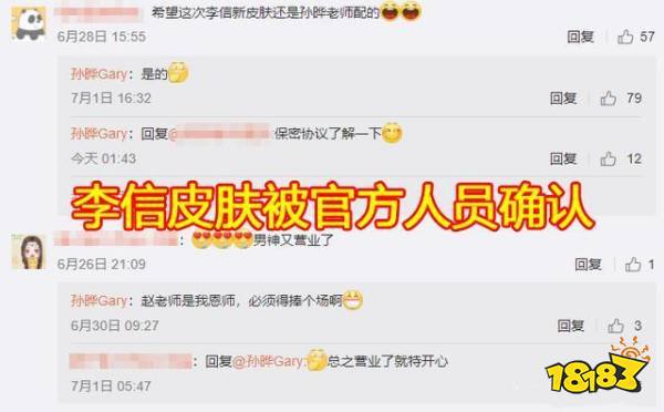 不过,这位上线于2018年11月88日的英雄,终于是熬出头了。之前一直传言李信将会有新皮肤,但事实上一直都没有官方的认可。但这次却是得到了官方工作人员的间接认可。在网友向李信官方配音人员孙晔询问李信新皮肤进度时,李信回复表明仍旧是他配的。