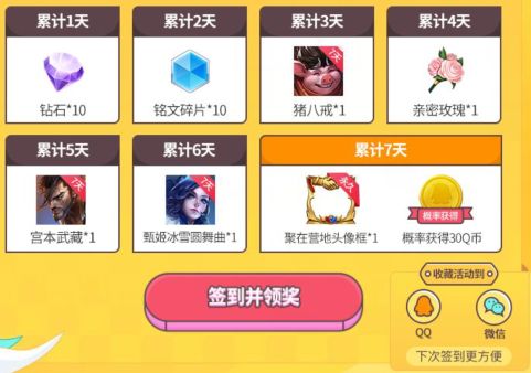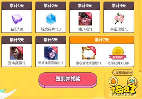 1.玩家在活动页累计签到1-7天可以领取对应天数的奖励,其中第七天的30Q币奖励为概率获得,非必中奖励。