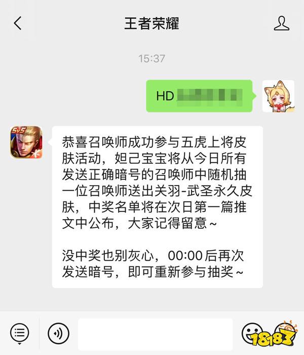 9月27日-10月8日,在公众号后台发送HD暗号(提示:五虎将参见),即可参与抽奖,官方每天将抽取幸运召唤师,送出好礼,每天都可参与一次)